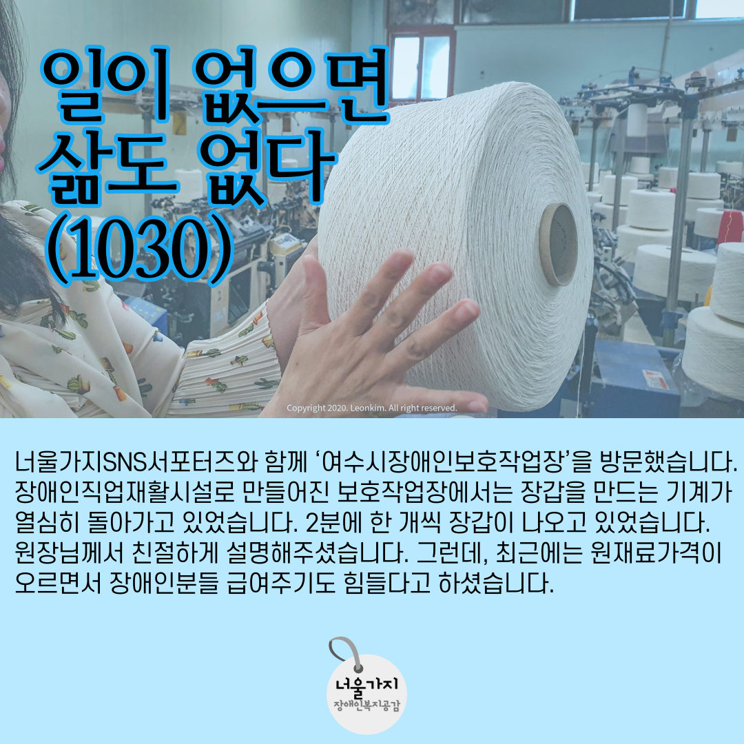 너울가지SNS서포터즈와 함께 ‘여수시장애인보호작업장’을 방문했습니다. 장애인직업재활시설로 만들어진 보호작업장에서는 장갑을 만드는 기계가 열심히 돌아가고 있었습니다.