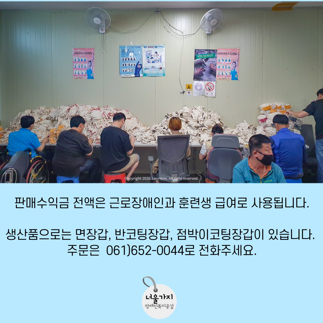 판매수익금 전액은 근로장애인과 훈련생 급여로 사용됩니다. 생산품으로는 면장갑, 반코팅장갑, 점박이코팅장갑이 있습니다.