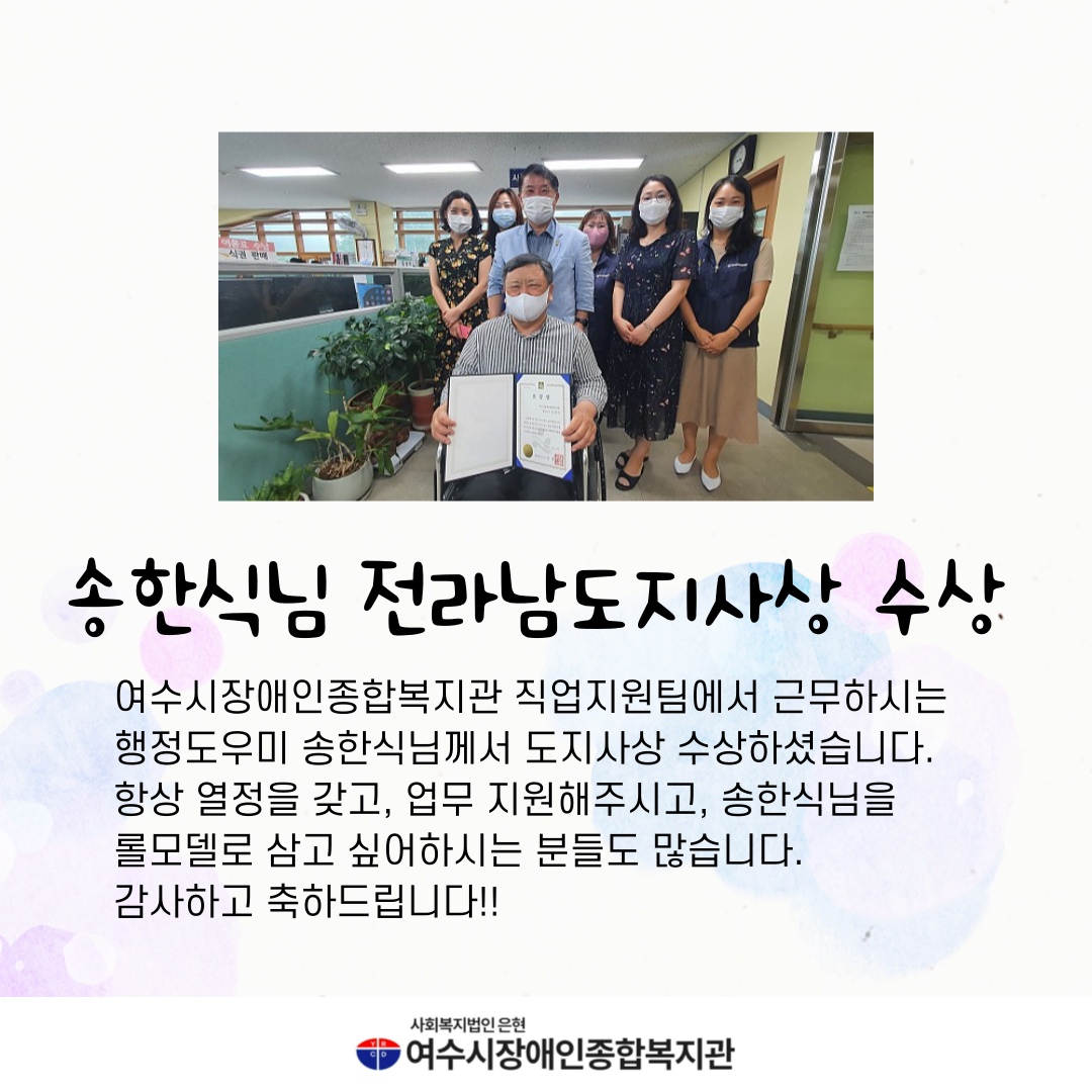 여수시장애인종합복지관 직업지원팀에서 근무하시는 행정도우미 송한식님께서 도지사상 수상하셨습니다.