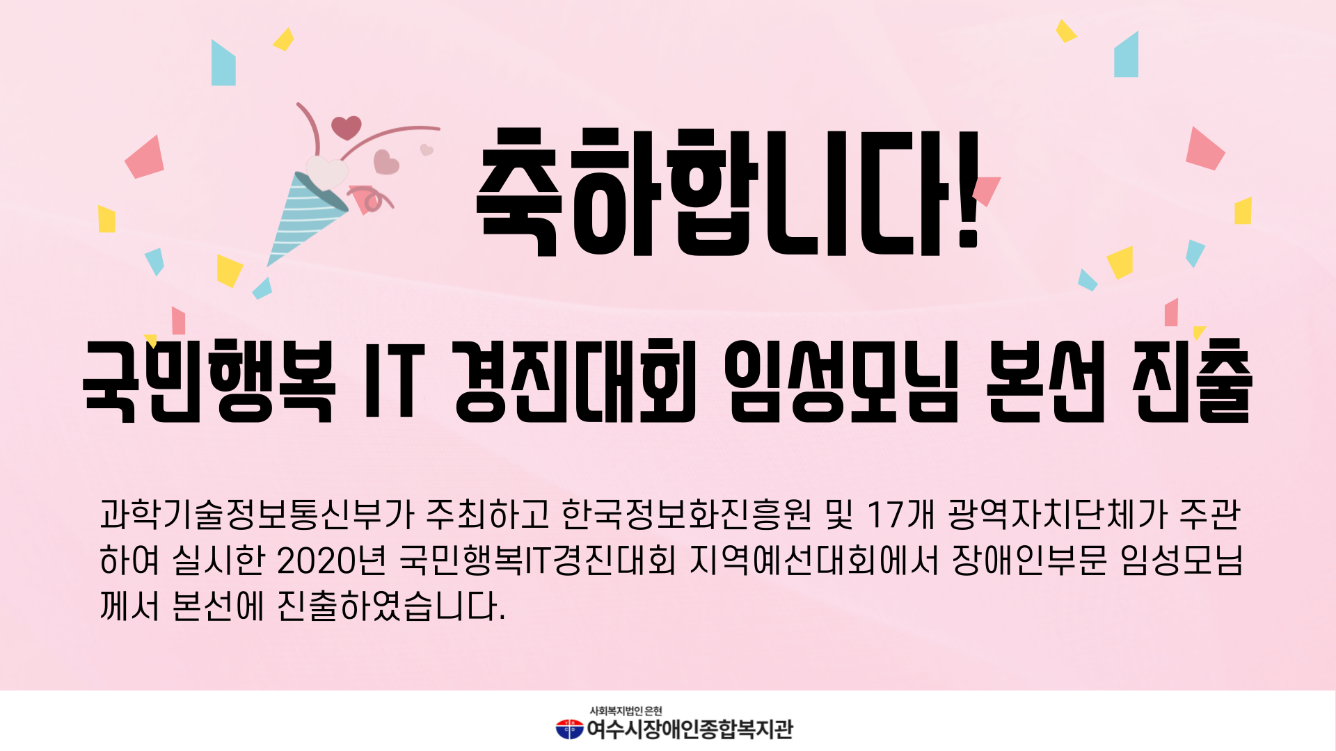 과학기술정보통신부가 주최하고 한국정보화진흥원 및 17개 광역자치단체가 주관하여 실시한 2020년 국민행복IT경진대회 지역예선대회에서 장애인부문 임성모님께서 본선에 진출하였습니다.