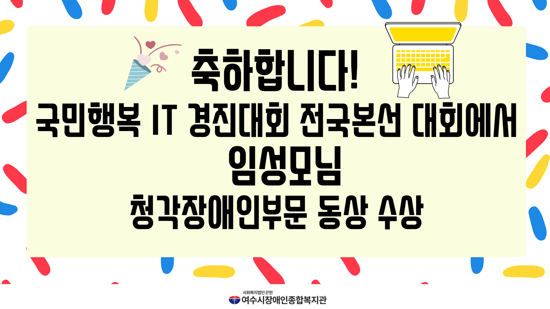 국민행복 IT 경진대회 전국본선 대회에서 복지관 이용자이신 임성모님께서 청각장애인부문 동상을 수상했습니다.