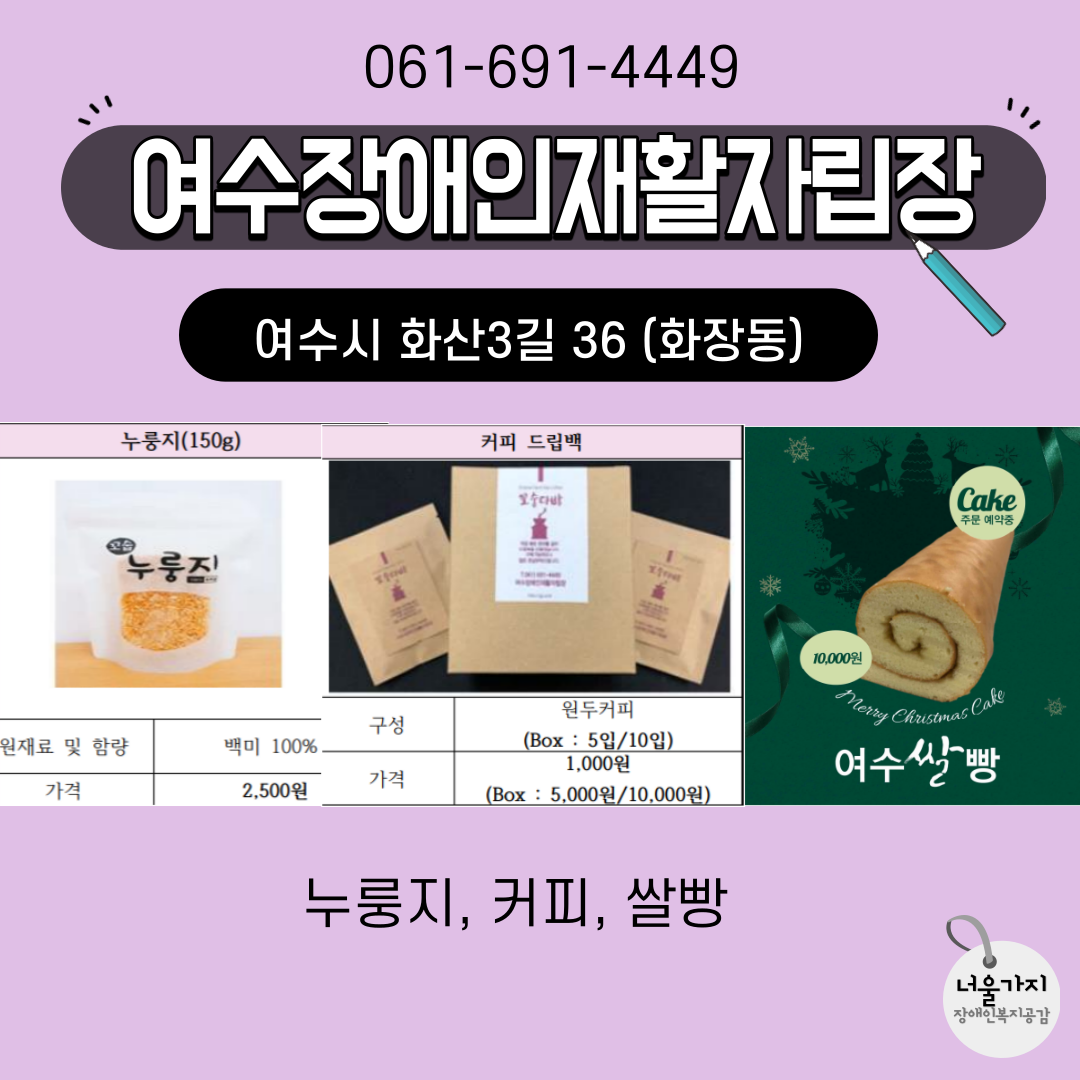 여수장애인재활자립장/누룽지,커피,쌀빵/061-691-4449
