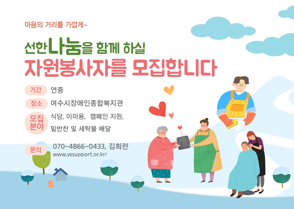 4월 25일 복지관 정상운영 됨에 따라 자원봉사자 분들의 손길이 필요합니다.
